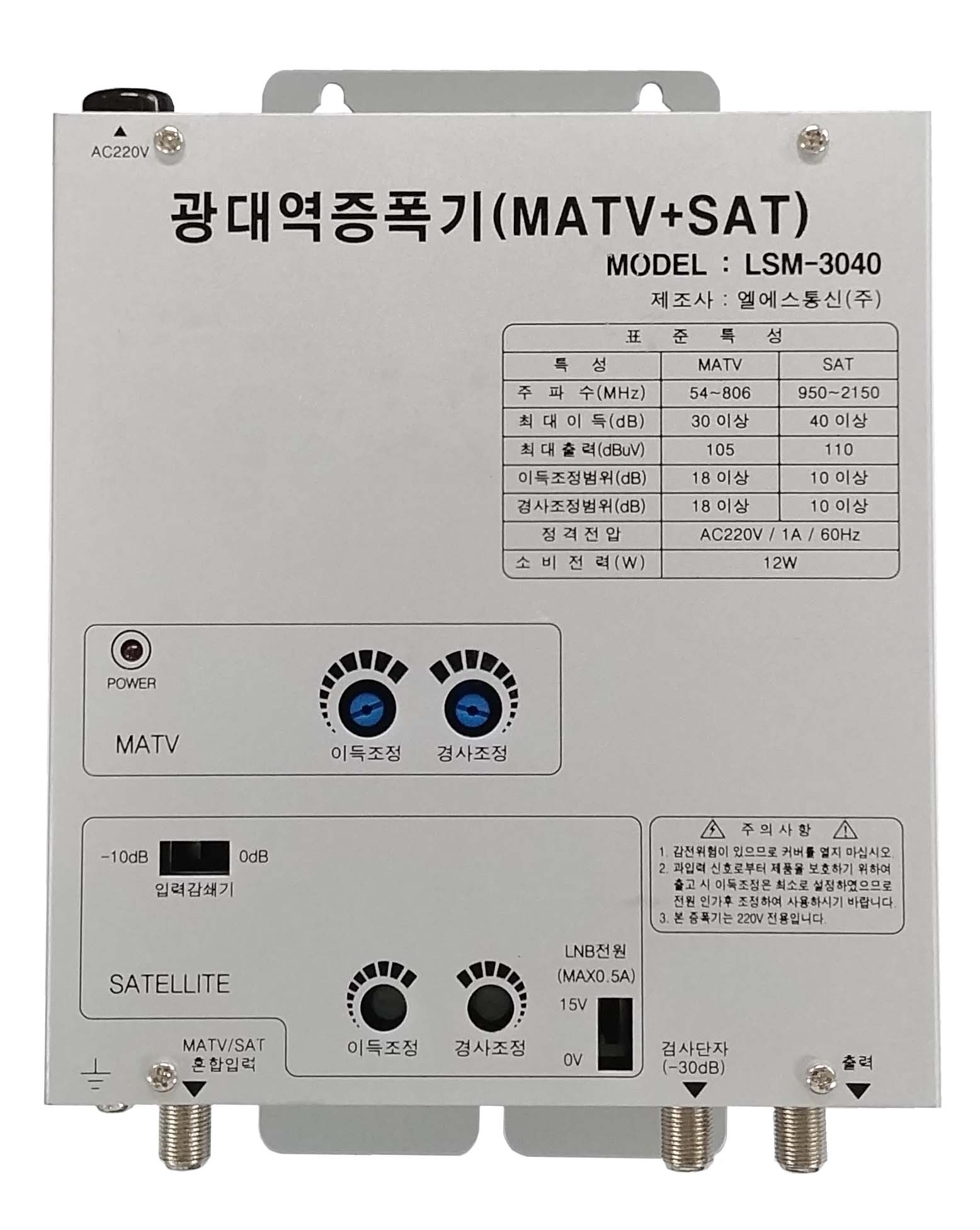 • 본 제품은 광대역증폭기로서 MATV 및 위성방송 IF대역(950~2,150MHz)을 혼합 전송하는 장비로